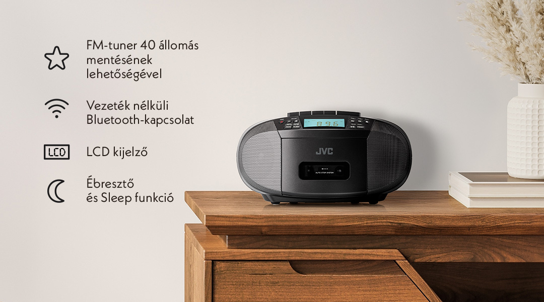 Radiomagnetofon JVC disponuje stereo výkonem 2 × 2 W a kompaktními rozměry, díky kterým se snadno přenáší. Díky možnosti provozu na baterie je ideálním společníkem i mimo domov – třeba na chatě, v dílně nebo na cestách.