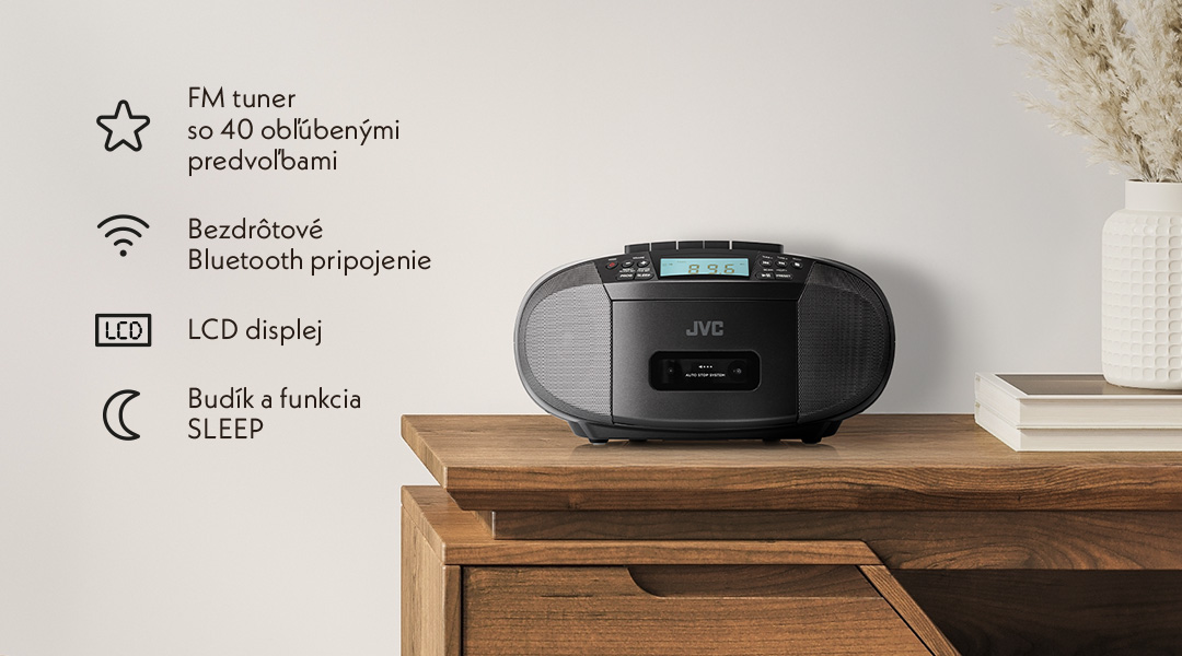 Radiomagnetofon JVC disponuje stereo výkonem 2 × 2 W a kompaktními rozměry, díky kterým se snadno přenáší. Díky možnosti provozu na baterie je ideálním společníkem i mimo domov – třeba na chatě, v dílně nebo na cestách.